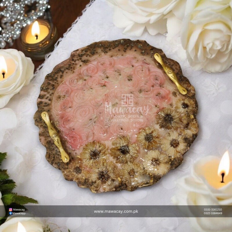 Celebrate special moments with these handmade Resin Trays, crafted from premium glossy resin for a stylish, durable, and artistic look. Each tray is uniquely handcrafted, making it a one-of-a-kind piece perfect for gifting or home décor. Ideal for Nikkah, engagement, anniversaries, or sending best wishes, these trays add charm and elegance to any celebration or living space.